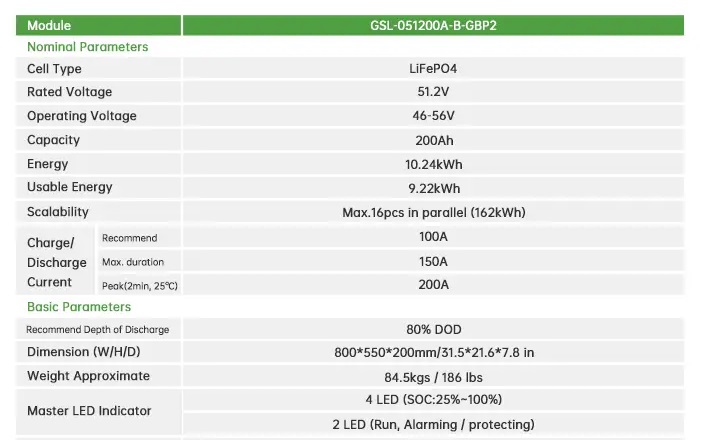 The GSL 51.2V 200Ah 10kWh Wall-Mounted Lithium Iron Phosphate Battery is engineered for home energy storage applications, offering a flexible and scalable solution for managing energy needs. Featuring a robust waterproof design with an IP50 rating, this battery is suitable for both indoor and outdoor installations, ensuring reliability across diverse environments. It boasts a lifespan of over 6500 cycles and an extensive warranty, underpinning its durable performance. The modular design allows parallel connection of up to 16 units, permitting capacity expansion to suit increasing power demands. Equipped with an intelligent Battery Management System (BMS), it provides real-time monitoring and efficient management of energy. The battery is compatible with a wide range of hybrid inverters, reflecting its versatile application in various energy configurations. This product represents a practical choice for users seeking assured safety, longevity, and intelligent control over their energy storage systems.