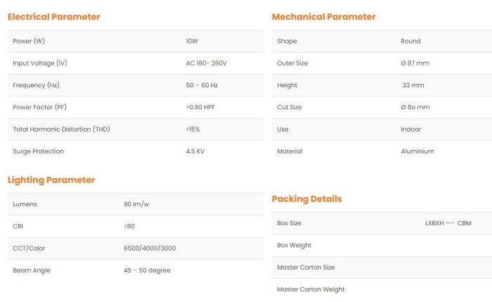 This is a wide beam angled downlight. It has a lens to cut down the glaring and meets UGR less than 19 standard. Thin borders, classy reflector and lens designed to meet latest standard makes it look apart. Cree, USA or equivalent LED COB’s are used with lumen efficacy of more 140 lm/w. The depth of the product is less in comparison to other downlight available in the market and hence can be used in false ceiling where depth is an issue. Can be used to replace panel light in many cases.
