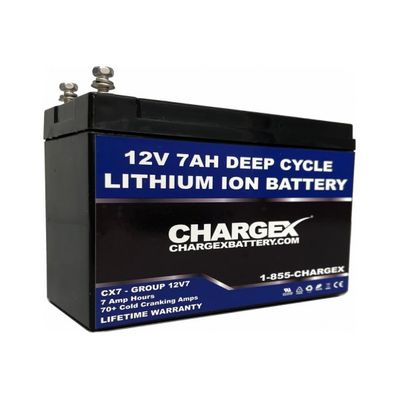 The Chargex CX7 - 12V 7AH Lithium Ion Battery features the latest and most advanced Lithium Iron Phosphate - LiFePO4 Battery Technology. Designed for Deep Cycle applications, the CX7 is engineered with our - High Output 3.2V Stainless Steel LiFePO4 Cells that are bolted together for Rigid Strength and Current Conductivity vs. the tab welded method. The CX7 is Plug and Play for any application that currently uses lead acid, gel or agm batteries.