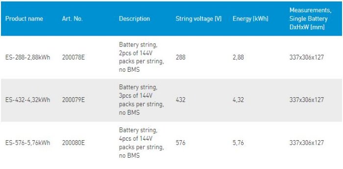 The 12V Module is the building block of Nilar battery packs. It is comprised of 10 cells connected in series, achieving a nominal module voltage of 12V. As a building block, it provides excellent flexibility in battery pack voltage. The nominal voltage of a battery packs is determined by the number of 12V modules connected in series within the battery pack. When a battery pack contains 12 modules, the pack voltage is 144V. Battery packs are connected in series to match the required system voltage, forming a string. The nominal voltage of a string equals the number of battery packs multiplied by the nominal battery pack voltage. Battery packs are sold in string configurations, with voltage and energy adaptable to a customer’s needs. Here are the strings available with 144V batteries.