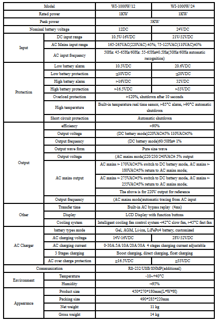 This heavy duty 1000W low frequency pure sine wave inverter charger approved by CE standards. It is a combination of an power inverter, AC battery charger and AC auto-transfer switch into one complete system with a peak DC to AC conversion efficiency over 85%.