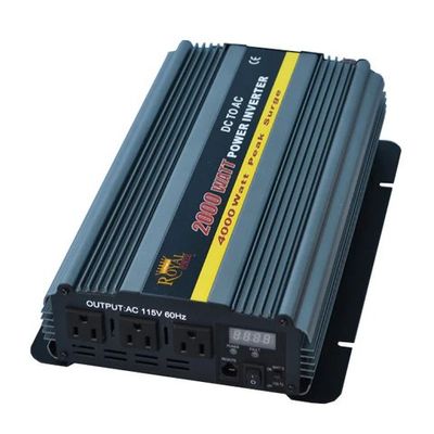 2000 Watt 12 Volt DC to 120 Volt AC Royal Power Modified Sine Inverter provides 16.7 amps of AC power. This size dc to ac power inverter can handle small motors up to 0.5hp. Included is a digital monitor and helps keep track of battery voltage and wattage load input. 2000 Watts of power will allow you to run a full range of power tools, household appliances and backup water pumps. Royal Power has put its famous stabilizing system into this dc to ac power inverter which makes it ideal to handle the shocks of the road.