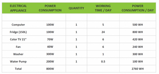 Electrical appliance: LED light. Power consumption: 10W. Quantity: 5. Working time/day: 8. Powei consumption/day: 400 WH.