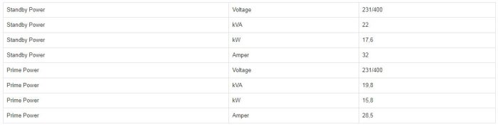 - Standby Power (kVa/kw): 25/20