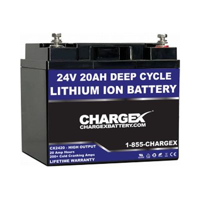 The Chargex CX2420 - 24V 20AH Lithium Ion Battery features the latest and most advanced Lithium Iron Phosphate - LiFePO4 Battery Technology. Designed for Deep Cycle applications, the CX2420 is engineered with our - High Output 3.2V Stainless Steel LiFePO4 Cells that are bolted together for Rigid Strength and Current Conductivity vs. the tab welded method. The CX2420 is Plug and Play for any application that currently uses lead acid, gel or agm batteries. The fully automatic Built In Battery Management System provides cell balancing, over charge or over discharge protection, short circuit and reverse polarity protection all making the CHARGEX CX2420, one of the world`s safest and most advanced lithium batteries.