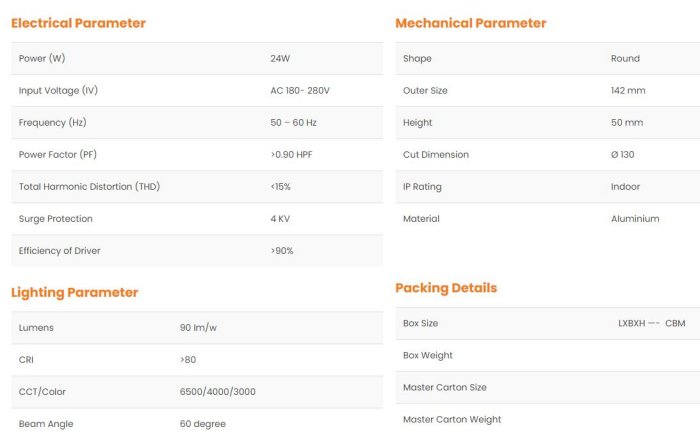 This is a wide beam angled downlight. It has a lens to cut down the glaring and meets UGR less than 19 standard. Thin borders, classy reflector and lens designed to meet latest standard makes it look apart. Cree, USA or equivalent LED COB’s are used with lumen efficacy of more 140 lm/w. The depth of the product is less in comparison to other downlight available in the market and hence can be used in false ceiling where depth is an issue. Can be used to replace panel light in many cases.