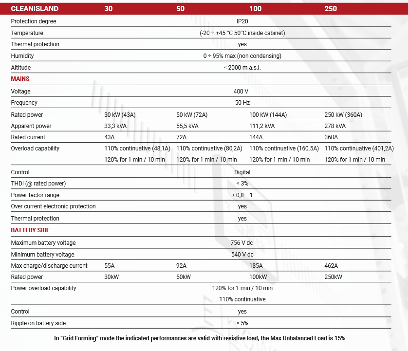 With a power range between 30kW and 500kW Cleanisland is the best solution for applications with different energy sources and different storage capability. The conversion system is based on a DSP control, specifically designed for off grid applications and it has two working modes: