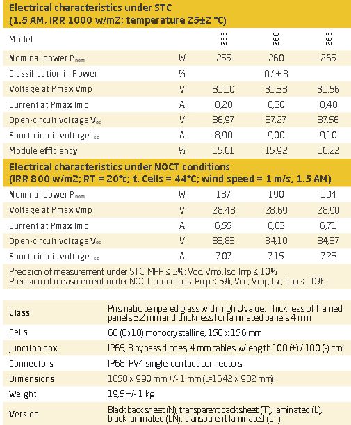 Also available in the following variants: Black backsheet (suffix N). Transparent backsheet (suffix T). Frameless laminate (suffix L). Frameless laminate and black backsheet (suffix LN). Frameless laminate and transparent backsheet (suffix LT). Production of photovoltaic modules.
