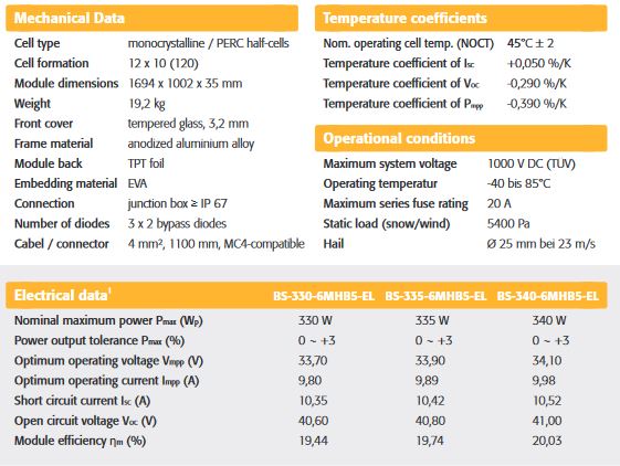 Half-cut mono module 330 - 340W. Dimensions: 1694 x 1002 x 35mm. Weight: 19,2kg. Product warranty: 20 yrs. Performance guarantee: 25 yrs.