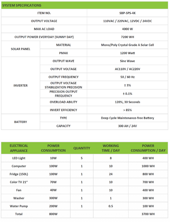 8 pes Solar Modules 150w/pc or 5 pes 250w Solar Panels. 1 set Solar Charger Controller. 1 set Sine Wave Inverter 4000W or 2 sets Sine Wave Inverter 2000W. Deep Cycle Maintenance-free Battery 24V 300AH (12V/100AH x 6 pes). Bracket for the solar panel module. Junction box. Voltage Transfer Module + 2 pes Super Brightness LED Bulb. One year free technical support.