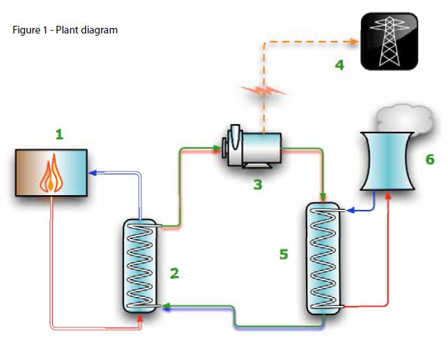 The structure of the proposed plant is based on the so-called low-temperature organic Rankine cycle (LT-ORC), and may be summed up by the diagram in Figure 1. A heat source [1] generates heat, which is conveyed through a vector fluid circulating into a closed loop to one or more primary heat exchangers, usually a preheater and an evaporator [2], where said heat is transferred from the vector fluid to the working fluid.