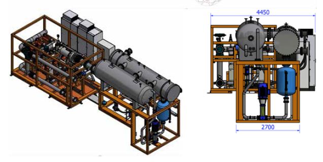 The power generation module is supplied mounted on two interconnected self-supporting frames (“skids”), one of which houses the “hot side” components (turbine, evaporators, preheaters...) while the other houses the “cold side” - regenerator, the condenser, the working fluid tank and pump.