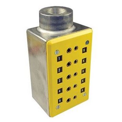 5 position type K patch panel or junction box with threaded bore for attaching conduit.