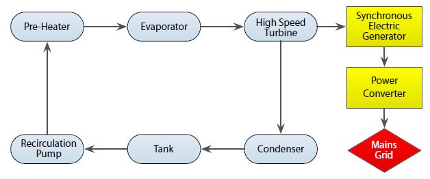 - Storage tank to keep the condensed working fluid in liquid form and recirculation pump to pump the fluid back in the ORC loop;