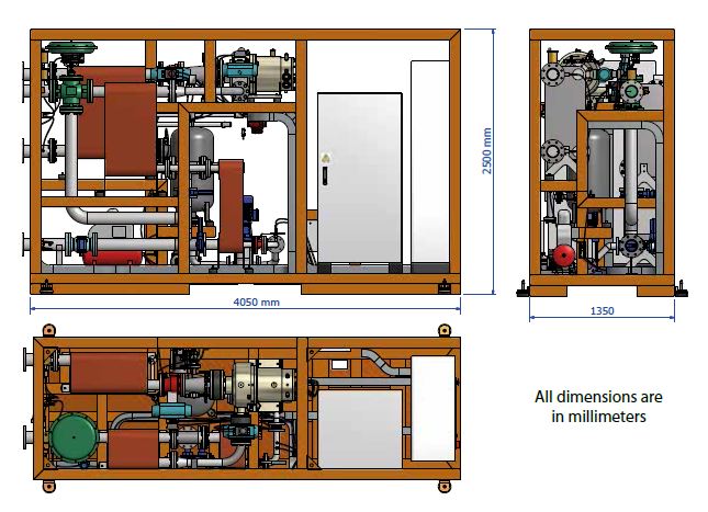 The ORC module is supplied mounted on a self-supporting frame (“skid”) hosting all module components, ready to be connected to heat source and heatsink.