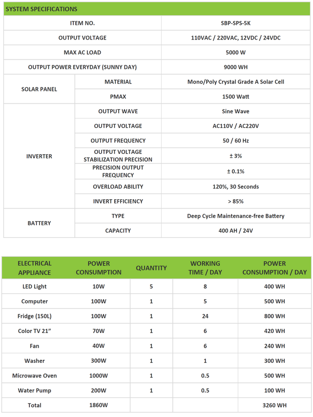 10 pes Solar Modules 200w/pc or 8 pes 250w Solar Panels. 1 set Solar Charger Controller. 1 set Sine Wave Inverter 5000W or 2 sets Sine Wave Inverter 2500W. Deep Cycle Maintenance-free Battery 24V400AH (12V/100AH x8 pes). Bracket for the solar panel module. Junction box. Voltage Transfer Module + 2 pes Super Brightness LED Bulb. One year free technical support.