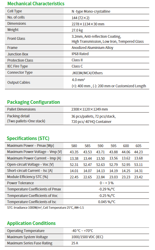 Jinko Solar - Model Tiger Neo 72HL4-(V) -580-605 Watt Mono-Facial Module