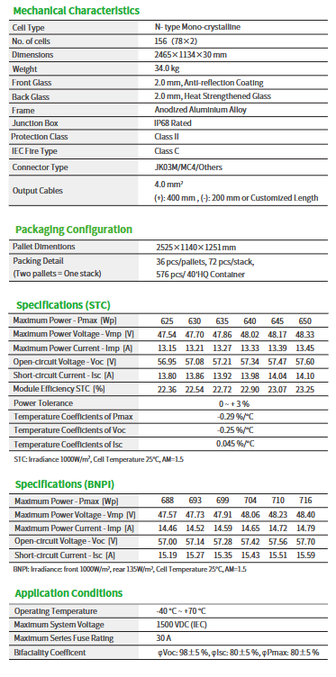 Jinko Solar - Model Tiger Neo 78HC-BDV -625-650 Watt Bifacial Module with Dual Glass