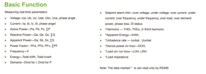 SPM32 is a small size multifunction power meter, suit for 72*72mm panel mounting and DIN Rail mounting. With Setpoint alarm function, it can offers to SCADA system, EMS application