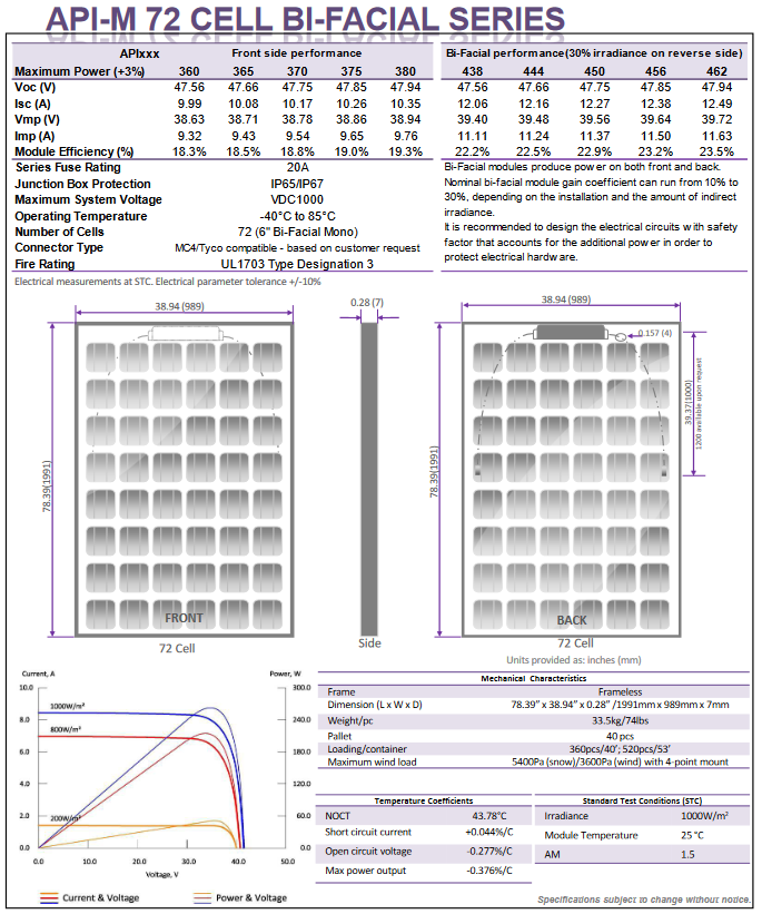 APIModel 360 – 380 WATT -72 Cell Bi-Facial Mono-Crystalline PV Modules