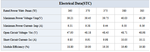 Cell Type: monocrystalline 156.75*156.75mm,5BB. Cell number: 72cells (6*12). Dimensions: 1960*992*40mm. Front glass: 3.2mm High transmission,Low lron,Tempered ARC Glass. Backsheet: White Black-sheet. Junction box: Potted.IP 67.1500VDC.3Schottky bypass diodes. Frame: Anodized Aluminium Alloy Type 6063T5, silver color. Connector: MC4 Compatible