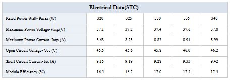 Cable: 4.0mm²/ 12AWG, 1200mm length. Standard Test Conditions: AM1.5 100MW/cm 25°C.