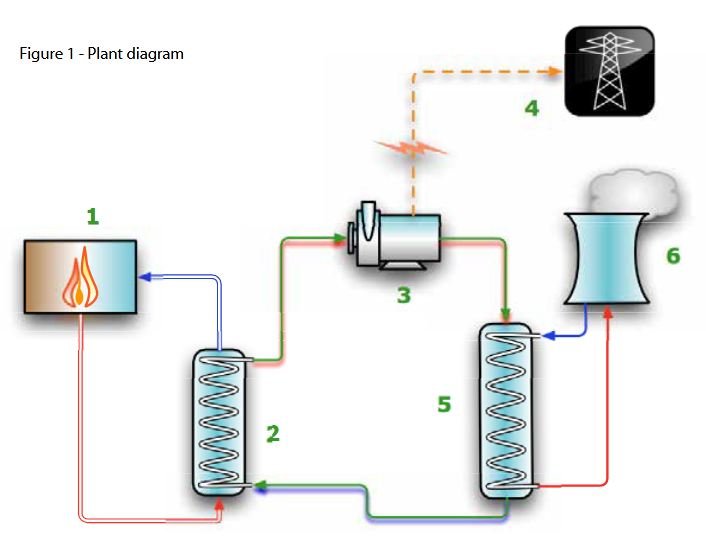 Downstream the turbine, the working fluid - still in gas phase - is conveyed to another heat exchanger, called a condenser (5), where it is cooled, releasing its excess heat and condensing back into a liquid which is collected in a condensation tank, ready to be sent back to the primary heat exchanger by a recirculation pump, thus closing the loop.