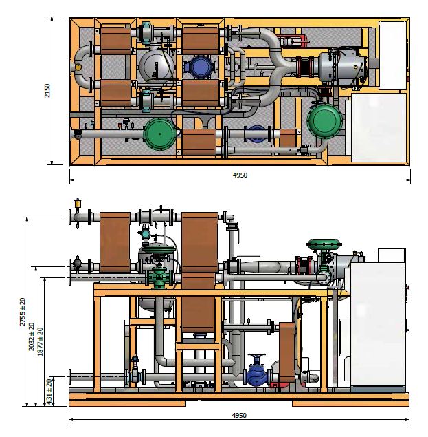 The following drawings show the standard version of the ZE-75-LT ORC power generation module, which weighs about 5 tons an is designed for indoor installation.