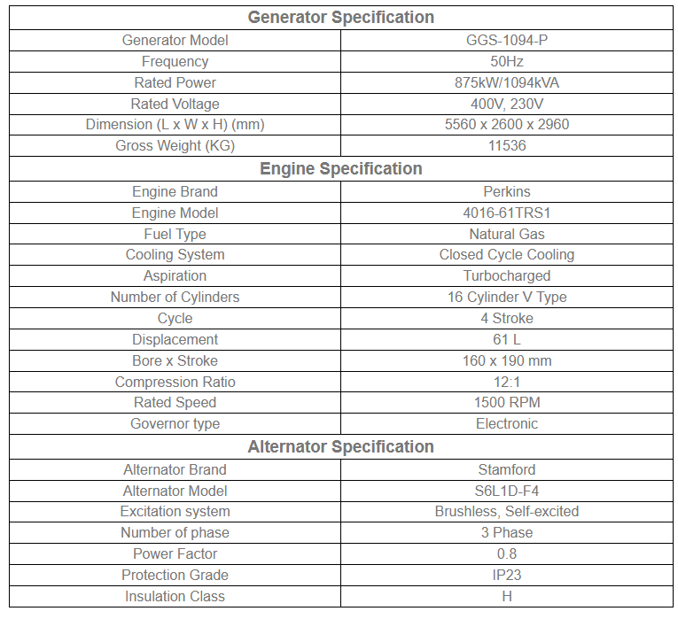 The high-performance Natural Gas Generator offers a substantial rated power of 875kW and 1094kVA, leveraging the robust capabilities of its 16 Cylinder Perkins 4016-61TRS1 Engine. Engineered with closed cycle cooling technology, this generator ensures enhanced efficiency and durability for demanding applications.