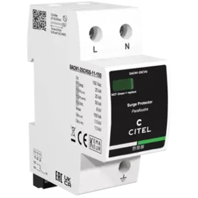 The Type 1+2+3 AC surge protector is designed specifically for single phase systems, providing comprehensive protection against electrical surges caused by lightning strikes or industrial disturbances. This device effectively shields sensitive electronic equipment by limiting over-voltage brought on by these incidents, ensuring the reliability and longevity of connected appliances. The DACN1 series, including variants such as DACN1-25CVGS-11-150 and DACN1-25CVGS-31-385, offers scalability and adaptability for a variety of electrical environments. With operational application in both AC and DC systems, the surge protection device aligns with standards ensuring high performance in surge protection. Citel's range of surge protectors is primarily designed for industries requiring robust electrical safeguarding, facilitating optimal protection in both residential and commercial infrastructures.