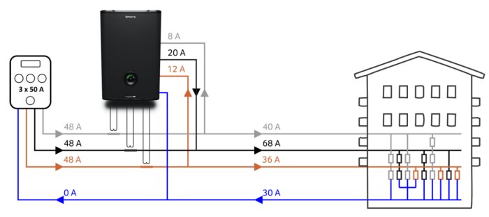 These problems can be solved with the Current Equalizing Technology. Similar to the load shedding relay the current equalizer sense the supply currents, but instead of disconnecting loads during over current situations, energy is instead transferred between the phase conductors and the supply current is limited. The current equalizer utilizes the fact that domestic electrical installations today are dominated by single phase loads and often has a large degree of asymmetry between the three phase conductors. When an over current occurs in one phase conductor there will still be headroom in the remaining two phase conductors.