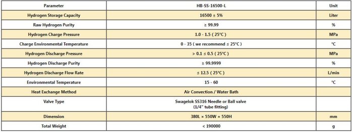 While charge with only 99,99% purity hydrogen the HB-SS-16500-L is capable to provide high purity hydrogen (over 99.9999%). It makes HB-SS-16500-L an ideal pure hydrogen source Fuel Cell systems, that is in addition easy to use and very safe.