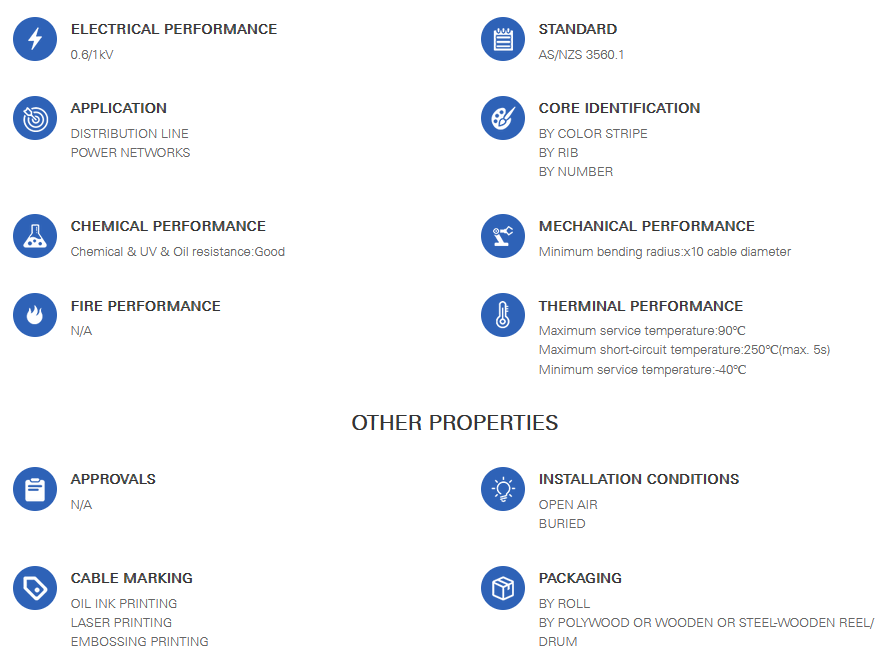 The aerial bundled cables are used for overhead distribution line and electrical installations with alternating power networks with nominal voltage UO/U 0.6/1 kV or in direct power networks with maximum voltage according to land 0.9kV.