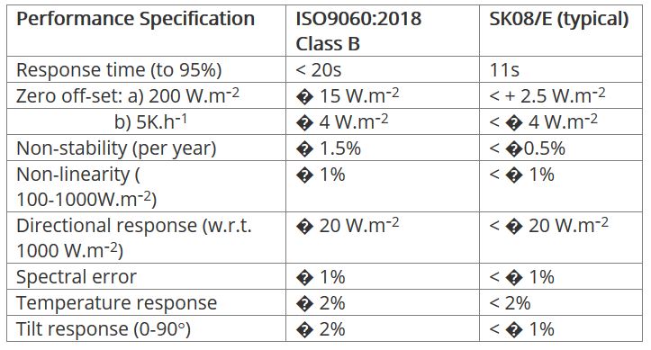 The Middleton SK08 is an affordable pyranometer for the measurement of global solar irradiance on a plane surface. It meets the ISO specifications for a Class B pyranometer. The SK08 incorporates a passive thermoelectric sensor. The SK08-E version has an inbuilt signal amplifier.