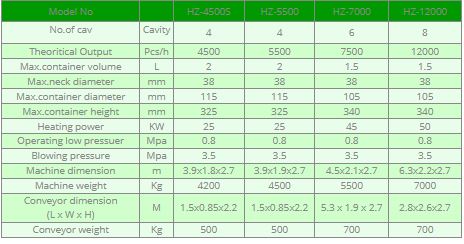 Big mould capacity: max bottle size is 2L for 4 cavity machine. Energy-efficient: preforms are hanging-heated, decreased consumption of the electricity. High-speed: shorter center distance of preforms made blowing speed higher. High-standard components: Germany/American pneumatic components are adopted. Convenient: push type mould installation made moulds changing faster. Precise: parts are manufactured by CNC to ensure the preciseness of every part.