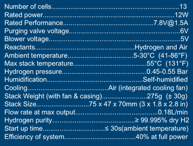 Semi-integrated 12W fuel cell system. Includes: Integrated fan and casing. 12W stack with blower.