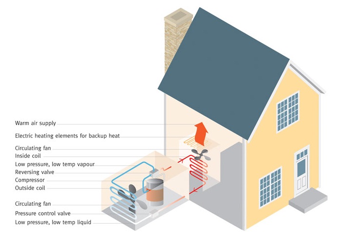 Heat from the air is absorbed into a fluid which is pumped through a heat exchanger in the heat pump. Low grade heat is then extracted by the refrigeration system and, after passing through the heat pump compressor, is concentrated into a higher temperature useful heat capable of heating water for the heating and hot water circuits of the house.