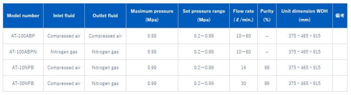 - Nitrogen (95% to 99.9%) can be easily obtained by supplying compressed air. (models AT-10NPB and AT-30NPB)