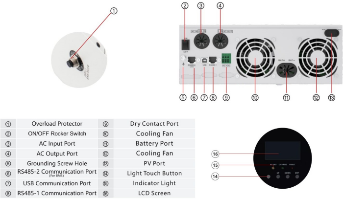 Performance characteristics: Load friendly: Stable sine wave AC output via SPWM modulation. Supports a wide range of battery technology: GEL, AGM, Flooded, LFP, and program. Dual LFP battery activation method: PV&mains. Uninterrupted power supply: simultaneous connection to utility grid/generator and PV. Intelligent programming: the priority of the output from different energy sources can be set. High energy efficiency: up to 99.9% MPPT capture efficiency. Instant viewing of operation: the LCD panel displays data and settings ,while you can also be viewed using the app and webpage. Power saving: power saving mode automatically reduces power consumption at zero-load. Efficient heat dissipation: via intelligent adjustable speed fans. Multiple safety protection functions: short circuit protection, overload protection, reverse polarity protection, and so on under-voltage and over-voltage protection and reverse polarity protection.
