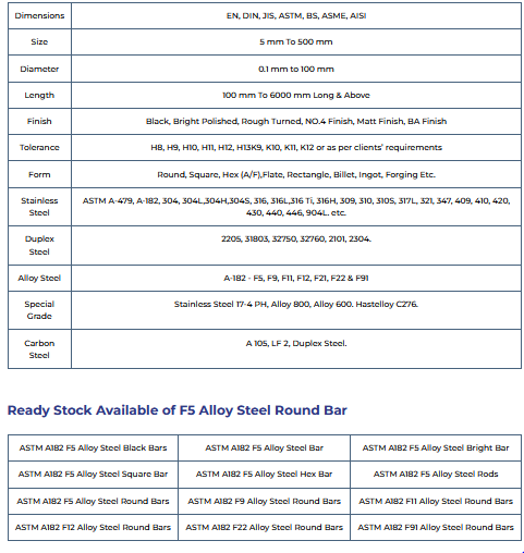 Triton Alloys Inc. Is The Most Acclaimed Manufacturer, Exporter, Distributor And Supplier Of Industrial F5 Alloy Steel Round Bars With Required Test Certificates. Our material is certified to the highest industry standards. You can also Order small quantities, we will be happy to quote best price for small and large quantities & can typically deliver the Alloy Steel Round Bar in minimum time frame anywhere around the globe.