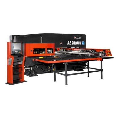 AMADA AE-2510 NT - Punching capabilities: Punching force = 200 kN. Drive system = Single AC servo drive. Number of stations = 45. Machine frame = Bridge frame. Axis travel distance = 2500 x 1270 mm. Type of table = Table with standard brushes. Table load capacity = 150 kg.