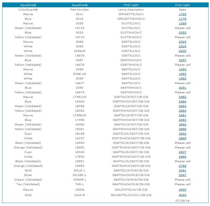 First Light Technologies, Inc. is pleased to announce the availability of compatible and economical Aquafine SE (single ended) and DE (double ended) replacement lamps. First Light offers the cross reference below for the Aquafine ColorGuard system but does not attempt to duplicate or copy the ColorGuard system as it is a unique feature of the Aquafine Corporation.