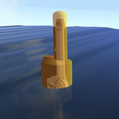 Mechanical Power GenerationThe device is free-floating in 6 degrees of freedom and generates power primarily in the heave DOF, with some power generated in the surge & sway components of device motion. The device generates power on the rise of the wave by reacting against the seafloor via high tensile forces in the main PTO mooring line between the device and the mooring anchor. These tensile forces rotate the PTO drum in its bearings and produces high torque, low RPM power at the PTO shaft. This is then stepped up via the synchronous gear drive to the generator. In parallel to the generator, energy is stored in the pneumatic spring/pre-load system. On the fall of the wave the PTO operates in a “motoring” condition by a combination of releasing energy stored in the pneumatic return spring system and operating the generator as a motor in the opposite direction which reels in the PTO mooring line. The power production cycle is then restarted.