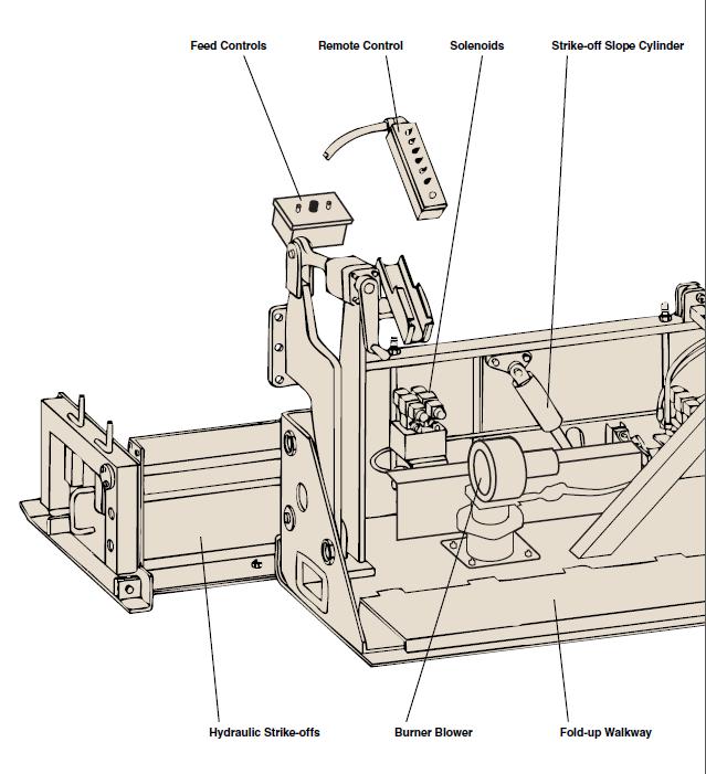 Feed controls are conveniently located on both the left and right sides of the screed. Power crown, burner, horn controls, vibratory frequency adjustment and optional slope controller are easily accessible on panels at the center of the screed.