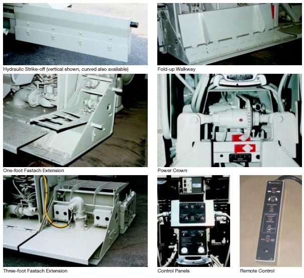 Optional hydraulic strike-offs extend at the touch of a button to give you a 14 foot (4267 mm) paving width with the Fastach 8 and an 18 foot (5486 mm) paving width with the Fastach 10. Right and left hand strike-offs are remote control operated and will hydraulically slope positively.