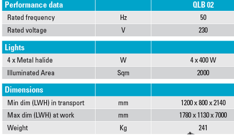 QLB 02 provides a flexible lighting solution by allowing users to easily plug into any power source including auxiliary power, electrical generator or directly into the grid. It is an ideal light tower for events, general metropolitan construction, road construction and temporary public lighting. Its 4 x 400W metal halide floodlights can illuminate a space up 2.000m2 with bright, safe light.