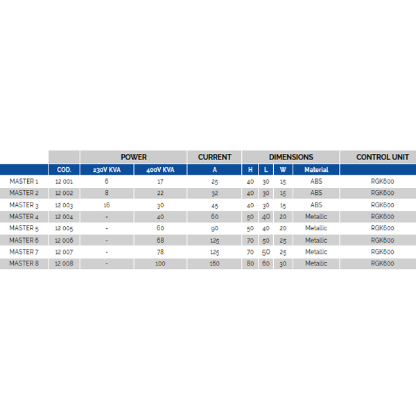 Automatic panel complete with management and control unit (AMF) + and switching module (ATS). The AMF control unit in the control panel MASTER is designed for the management of all types of generator sets thanks to its simple and flexible programming. Switching between mains/generator is configured by means of contactors or motorized disconnector installed inside the MASTER panel itself. The Master panel series is installed in thermoplastic or metal enclosures, depending on the switching power.