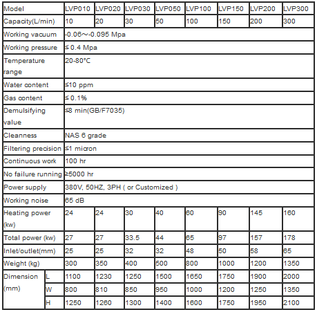 LVP-Series Vacuum lubricant oil purifier is specially designed for maintaining absolute cleanliness of hydraulic and lubricant oils, the particulate and moisture contamination in oil will affect the performance and life of mechanical equipment, LVP machine can separate water, gas, particles rapidly and demulsify completely for recovery of oil’s properties, such as viscosity, flash point, performance etc. And so as to greatly extend lifetime of machinery. This oil purifier also can be used for purification of turbine oil, gear oil, engine oil,compressor oil, refrigeration oil and other industrial oils, so it is wildly applied in electric power, metallurgy, mining, chemicals, transportation, manufacturing, petroleum, railway etc. LVP-series lubricant oil purifier is the most reliable, versatile, durable, and user-friendly machine in the industry today.