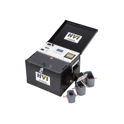 The DTS-60A(F) oil dielectric AC test set from High Voltage, Inc. is a sophisticated tool engineered to evaluate the voltage breakdown levels of insulating oils. Integrated with pre-set global standards, this equipment provides automated testing with the push of a button, accommodating custom test sequences as needed. It features a memory function for storing results, which can be downloaded or printed via an onboard thermal printer. Built for durability, the test set is encased in an aluminum and steel structure, designed to endure the demands of both field operations and laboratory environments. Its HV transformer is housed within a leak-proof, gasket-sealed steel tank, ensuring safety and reliability. The unit's lightweight and rugged construction makes it ideal for mobile usage and various testing applications, offering reliable performance in harsh environments. This test set is essential for professionals in electrical testing and maintenance, ensuring compliance with safety and performance standards.