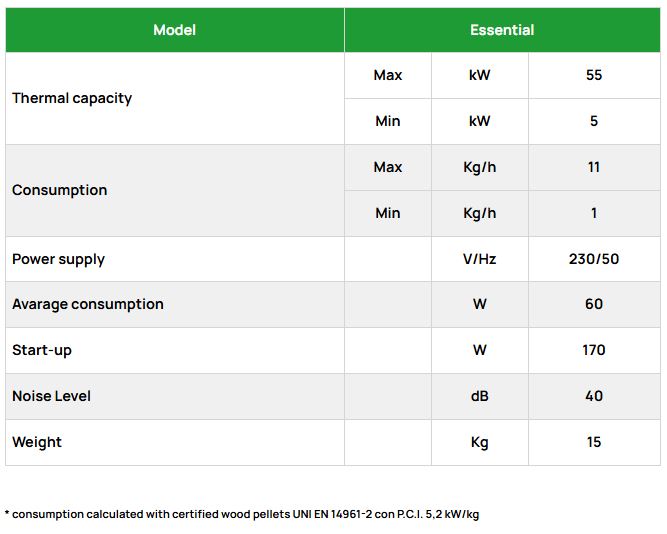 • Two-stage pellet loading using an external auger that loads the fuel from the tank to the burner and an internal auger that conveys everything inside the combustion chamber.